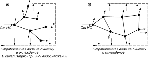 Рис.4.1. Схемы водопроводных сетей: а) разветвленная (или тупиковая); б) кольцевая сеть