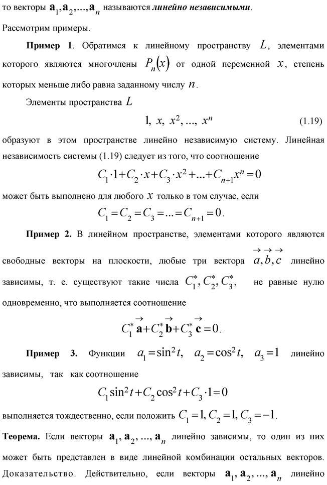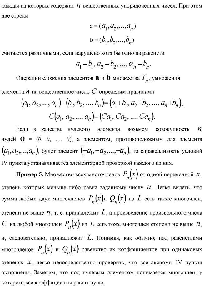 Рассмотрим теперь примеры линейных пространств функций. Сделаем сначала некоторые общие замечания. Пусть В предлагаемых ниже примерах рассматриваются функции с вещественными или комплексными значениями, т. е. Пример 6. Рассмотрим пространство всех многочленов степени, не превышающей Точно так же можно рассмотреть комплексное линейное пространство многочленов степени не выше Пример 7. Пространство непрерывных функций Пример 8. Пространство Пример 9. Рассмотрим множество
