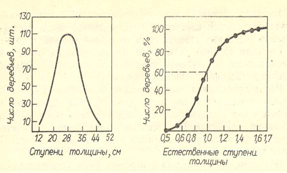Рис. 1. Распределение числа деревьев по ступеням толщины. Рис. 2. Накопленное распределение частот по естественным ступеням толщины (огива, кумулята) В спелых, естественно-сформировавшихся нормальных насаждениях, состоящих из одного элемента леса, распределение деревьев по ступеням толщины характеризуется симметричной одновершинной кривой, называемой кривой нормального распределения. Для насаждений сложных, смешанных, разновозрастных или пройденных рубками, вид кривой меняется. Например, для сложных разновозрастных древостоев, состоящих из нескольких пород и поколений, кривая может иметь две вершины или больше; в молодняках или насаждениях, пройденных рубками ухода по низовому методу, вершина кривой смещается вправо, в сторону толстых ступеней, а в древостое, пройденном выборочными рубками, влево, т. е. наблюдается асимметричное распределение, и т. д. Исследованием строения насаждений занимались многие зарубежные и отечественные ученые. Еще в 1880 г. немецкий ученый В. Вейзе выявил, что среднее по толщине дерево древостоя занимает строго определенное место. Оказалось, что число деревьев тоньше среднего диаметра составляет 57,5% от общего их числа, а толще 42,5%. Австрийский лесовод А. Шиффель (1903), при изучении распределение числа деревьев в процентном ряду от самого тонкого, до самого толстого ввёл понятие редукционного числа. Редукционное число это отношение любого диаметра деревьев к среднему арифметическому значению. Зная редукционные числа и средние значения таксационных показателей древостоя, можно найти значения этих показателей для любого дерева, занимающего разное положение в древостое без данных натурных измерений. Допустим, в еловом древостое со средним диаметром 40см требуется найти диаметр дерева, отстоящего от самого тонкого на 30 %. Тогда d30=Dср*Rd=40*0,84=33,6 см, где Rd - редукционное число по Шиффелю, равное 0,84. Из отечественных ученых наибольший вклад в изучение закономерностей строения насаждений внесли А. В. Тюрин и Н. В. Третьяков. Чтобы привести различные ряды распределения к сопоставимому виду, А. В. Тюрин перешел от абсолютных ступеней толщины в сантиметрах к относительным, выраженным в десятых долях от среднего диаметра, т. е. к редукционным числам по диаметру Rd. А. В. Тюрин назвал их естественными ступенями толщины. Принимая значение таксационного при знака среднего дерева насаждения за единицу, он проследил изменения по естественным ступеням не только диаметров, но и других таксационных признаков древостоев. Он выявил, что процентное распределение деревьев по естественным ступеням толщины не зависит от породы, класса бонитета и полноты, а лишь в некоторой степени зависит от возраста и большей мере - от характера рубок ухода. По данным А. В. Тюрина и других авторов (Н. П. Анучина, Н. В. Третьякова и др.) получены следующие выводы: 1. Если средний диаметр древостоя Dср принять за 1,0, то редукционное число Rd самых тонких его деревьев равно половине среднего диаметра 0,5 Dcр (по другим данным 0,4 Dср), а самых толстых — 1,7 Dср (в молодняках 2...2,5 Dср), т. е. самое толстое дерево в древостое примерно в 4 раза толще самого тонкого. Таким образом, все число стволов, по данным А. В. Тюрина, укладывается в рамки 13 естественных ступеней толщины. 2. Если последовательно суммировать число стволов по естественным ступеням толщины, начиная с 