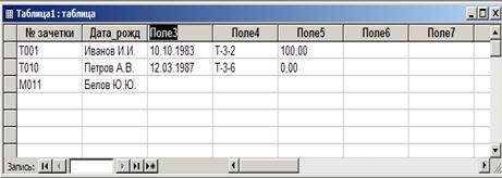 Рис. 4 - Режим таблицы. Ввод данных в строки и столбцы. - Конструктор. Создание структуры таблицы. - Мастер таблиц. Создание таблице путем выбора полей из существующих таблиц. - Импорт таблиц. Импорт таблиц и объектов базы данных из внешнего файла в новую таблицу Access. - Связь с таблицами. Создание таблицы, связанной с таблицей из внешнего файла.