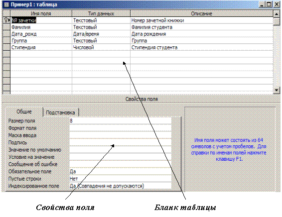 Если импортировать или связать данные нельзя, то чаще всего таблицы создаются в режиме конструктора, который позволяет определить требуемую структуру таблицы. В режиме конструктора таблиц (Рис. 12) можно увидеть названия, типы данных, описания назначения, а также некоторые дополнительные свойства полей таблицы. То, что появляется в верхней части окна таблицы, открытой в режиме конструктора, называется " бланком структуры таблицы " или просто " бланком таблицы ". В нижней части окна таблицы, открытой в режиме конструктора, выводятся свойства полей таблицы, а также краткое описание активного свойства таблицы.
