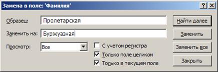 В процессе обработки базы данных может возникнуть необходимость заменить один объект другим во всей таблице, например, название улицы " Пролетарская " названием " Буржуазная ".
