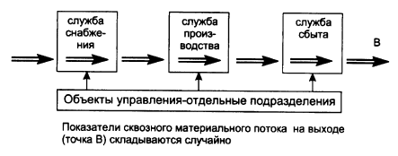 При этом обособленность предприятий - звеньев материалопроводящей цепи в значительной степени преодолевается с целью согласованного управления сквозным материальным потоком. Нужный груз начинает поступать в нужное место, в нужное время, в необходимом количестве, необходимого качества. Продвижение материального потока по всей цепи начинает осуществляться с минимальными затратами. На микроуровне цепь, через которую последовательно проходит некоторый материальный поток, чаще всего состоит из различных служб одного предприятия (рис. 4). При традиционном подходе задача совершенствования сквозного материального потока внутри предприятия, как правило, не имеет приоритетного значения ни для одного из подразделений. Показатели материального потока на выходе из предприятия, так же как и в первом примере, имеют случайное значение и далеки от оптимальных.