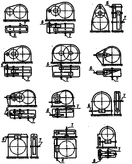 Рис. 12.1. Кинематический схемы редукторов: Б — быстроходный вал; Т — тихоходный вал Редуктор состоит из зубчатых или червячных передач, установленных в отдельном герметичном корпусе, что принципиально отличает его от зубчатой или червячной передачи, встраиваемой в исполнительный механизм или машину.