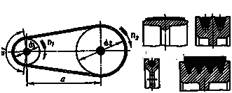 Ременную передачу относят к передачам трени- ем с гибкой связью. Она состоит из ведущего и ведомого шкивов и ремня, надетого на шкивы предварительным на- тяжением (рис. 13.1). Нагрузку передают силы трения, воз- никающие между шкивами и ремнем. В зависимости от формы поперечного сечения ремня пе- редачи бывают: плоским ремнем (рис. 13.1, а), клиновым ремнем (рис. 13.1, б), круглым ремнем (рис. 13.1, в), поликли- новым ремнем (рис. 13.1, г). Наибольшее применение в маши- ностроении имеют клиновые и поликлиновые ремни. Пере- дачу круглым ремнем применяют в приводах малой мощно- сти (настольные станки, приборы). Разновидностью ременной передачи является передача зубчатым ремнем; передающая нагрузку путем зацепления ремня со шкивами. Достоинства ременных передач. 1. Простота конструк- ции. 2. Возможность передачи движения на значительные рас- стояния (до 15 м). 3. Возможность работы с высокими часто- тами вращения. 4. Плавность и бесшумность работы. 5. Смягчение вибраций и толчков. 6. Предохранение меха-