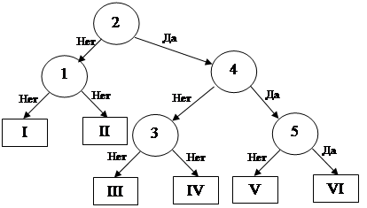 Имеется схема, представленная на рисунке 3.9. Интенсивности отказов элементов: λ1=0,56*10-4 1/ч; λ2=0,48*10-4 1/ч; λ3=0,26*10-4 1/ч; λ4=0,2*10-4 1/ч; λ5=0,32*10-4 1/ч; λ6=0,18*10-4 1/ч. Время измерения во всех точках одинаково и составляет 2 мин. Требуется составить оптимальную программу поиска неисправности при условии, что один из элементов отказал.