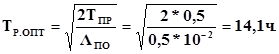 Примем значение величины среднего времени ТО объекта во время Р.Р. ТПР=1,5 ч. По расчету надежности, интенсивность отказов изделия Λ=10-2 1/ч. Тогда интенсивность постепенных отказов ΛПО=ТПРΛ. Время, затраченное на устранение отказов во время Р.Р. ТПР=0,5. Тогда ΛПО=0,5*10-2 1/ч. Из общего времени, затраченного на определение и устранение неисправностей, среднее время восстановления ТВ=1 ч. Оптимальная периодичность Р.Р. в соответствии с формулой (4.15)