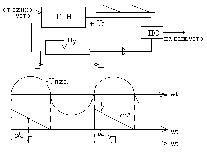 Сущность вертикального фазового управления заключается в сравнении переменного напряжения (пилообразной, синусоидальной, треугольной и других форм) с постоянным напряжением регулируемой величины, поступающим от устройств автоматического регулирования. На рис 34 представлена структурная схема одного из вариантов ФСУ подобного типа. Основными узлами его являются генератор пилообразного напряжения (ГПН) синхронизированный с синусоидальным питающим напряжением с помощью СУ, нуль-орган НО (компаратор) и источник регулируемого постоянного напряжения, величина которого UУ регулируется вручную или автоматически. В этой схеме формирование включающего импульса происходит в момент равенства пилообразного напряжения генератора Uг и напряжения управления UУ. При изменении UУ изменяется фаза управляющего импульса. Функции сравнивающего устройства выполняет нуль- орган “НО”, на входы которого поступают напряжения UУ и Uг. Нуль- орган может быть выполнен по различным схемам и на разной элементной базе. Например, может быть использована схема компаратора, выполненная на операционном усилителе. Генератор пилообразного напряжения в описанной схеме имеет линейно спадающее напряжение, мгновенное значение которого сравнивается с UУ. Обычно в таких ГПН используется процесс заряда емкости постоянным по величине током.