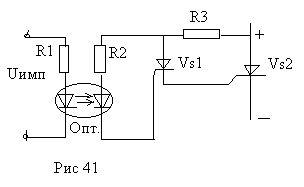 На рис 41 представлена одна из типовых оптоэлектронных тиристорных схем, используемых в качестве оконечного узла выходного устройства. Для согласования параметров силового тиристора VS2 и входных параметров фотодиодного оптрона “Опт” в схеме используется промежуточный тиристор VS1. Следует отметить, что в рассматриваемой схеме благодаря использованию оптрона влияние режима работы силового тиристора на электрические цепи СИФУ - незначительно. Для управления мощными фототиристорами разработан и применяется оптический способ. Сущность этого способа заключается в использовании для включения фототиристоров мощного направленного светового потока. В качестве источника такого потока могут быть, в частности, использованы лазеры.