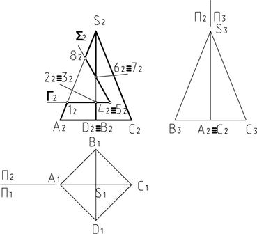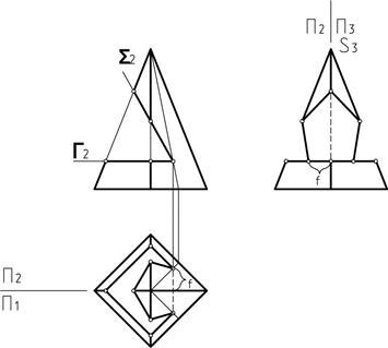 Заметим: На фронтальной плоскости проекций плоскость уровня Г (Г2) параллельна основанию пирамиды, на горизонтальной плоскости проекций она проецируется в натуральную величину и линии ее контура параллельны основанию пирамиды.