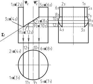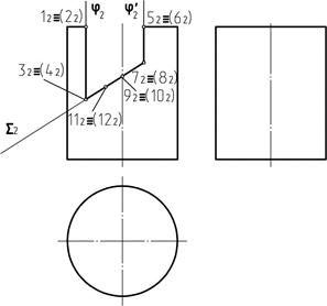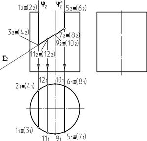Рис. 6.7 2 Этап. Заданные плоскости пересекают цилиндр по части эллипса и образующим. Для построения этих линий берем на плоскости П2 опорные точки, затем промежуточные. Используя геометрическое свойство цилиндра «собирать» все точки на вырожденную проекцию (на плоскости П1 в данном примере), строим проекции всех выбранных точек на плоскости П2.