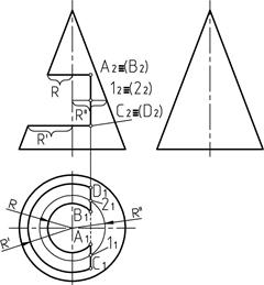Рис. 6.11 4 Этап. Соединяем точки с учетом видимости. 5 Этап. Обводим чертеж, убираем вырезанную часть конуса.
