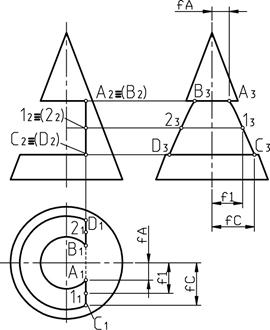 1 этап. Строим фронтальную проекцию выреза на конусе. 2 этап. Строим горизонтальную проекцию выреза. 3этап. Переносим полученные точки на профильную проекцию, используя правило построения недостающей проекции точки по двум заданным.