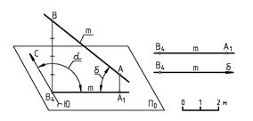 Азимутом α прямой называется правый угол между северным направлением меридиана (северным концом магнитной стрелки) и направлением падения (понижения) прямой. Азимут прямой измеряется в горизонтальной плоскости с помощью измерительных приборов и на плане, как правило, не указывается. Угол наклона δ прямой определяется вертикальным углом, образованным прямой и ее прямоугольной проекцией на плоскость Π0. Направление понижения прямой указывают стрелкой, около которой пишут величину угла δ. В зависимости от расположения прямых относительно плоскости Π0 различают прямые наклонные (общего положения), горизонтальные и вертикальные.