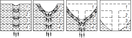 Живильні ємності можуть виконуватися у вигляді ящика, спільного для всіх висівних апаратів (у сівалках з невеликими міжряддями); або у вигляді окремої банки на кожен висівний апарат (у широкорядних сівалках). Насіннєві ящики зернових сівалок мають прямокутне січення у верхній частині і трапецевидне в нижній частині. Нахил стінок в нижній частині виконано під кутом, який більший кута тертя зерна об стінку, для того, щоб зерно зсипалось під дією власної ваги. В середині ящиків можуть бути зворушувачі або струшувачі. Витікання насіння або добрив із живильних ємкостей під дією власної ваги підлягає закону руху сипких середовищ і складається з ряду етапів, які схематично показано на рис. 5.4. Спочатку витікає насіння центрального над отвором стовпа, починаючи з верхнього шару, а потім насіння бокових шарів, починаючи від верхнього. Внаслідок цього утворюється лунка, яка поступово опускається. Кінець витікання характеризується опусканням лунки до дна. Насіння, яке залишилось, буде знаходитись під кутом обвалення, і його витікання через отвір може бути лише примусовим.