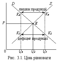 Ордината точки Е перетину кривих D і S вказує на ціну рівноваги Р, за якої попит урівноважується з пропозицією за обсягу виробництва Q1. Якщо, скажімо, попит зростає до точки К1, то це означатиме, що потрібно продати продукції обсягом Q2. Але цій потребі відповідає пропозиція в точці К2 за меншого обсягу пропозиції продукції Q3. Як бачимо, за таких умов виникає дефіцит продукції в розмірі Q2 — Q3. За зменшення попиту, наприклад, до точки К3 матиме місце зворотний процес — виникнуть лишки продукції, розмір яких також визначається в даному випадку різницею між Q2 і Q3. Проте насправді повний збіг попиту і пропозиції — явище тимчасове, що часто порушується. Попит і пропозиція змінюються під впливом ряду обставин і насамперед через зміну ціни. За її зростання збільшуватиметься пропозиція продукції, оскільки це економічно вигідно виробникам. Водночас зниження ціни стимулює зростання попиту на продукцію. Адже за тих самих витрат покупці матимуть можливість придбати більше продукції, ніж раніше. Сільське господарство й аграрні підприємства працюють в умовах ризику і невизначеності через істотний вплив природних факторів. Саме під дією цих факторів можуть безпосередньо змінюватися попит і пропозиція, встановлюватися нова рівновага, а отже, і нова ціна. Припустімо, що внаслідок епізоотії у спеціалізованих тваринницьких підприємствах різко скоротилася потреба в концентрованих кормах. Досягнута раніше рівновага в точці Е1 (рис. 3.2, а), якій відповідає ціна Р1, буде порушена через скорочення попиту, що графічно відображається зсувом кривої D ліворуч до D1. Пропозиція зерна при цьому залишається сталою, оскільки його виробники не змогли своєчасно зреагувати на зміну попиту, а тому характер кривої S не змінюється. Внаслідок цього склалася нова рівновага в точці Е2. якій відповідає ордината Р2 — ціна, рівень якої нижчий за ціну Р1. Але не виключена можливість, що попит на зерно може зрости внаслідок розширення спеціалізованими тваринницькими підприємствами поголів’я худоби, що спричинятиметься підвищенням попиту на тваринницьку продукцію. Якщо підприємства — виробники зерна своєчасно не зреагують на вимогу ринку і пропозиція зерна залишиться незмінною, то раніше досягнуту рівновагу в точці Е1 буде порушено (рис. 3.2, б). В результаті виникає нова рівновага між попитом D2 і пропозицією S у точці Е3, якій відповідатиме і вища ціна на зерно Р3. В даному випадку різниця між Q3 і Q1 — це дефіцит зерна, а між Q1 і Q2 — його лишок.