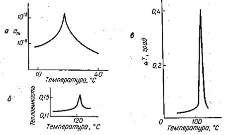 Рис. 2.10.4. Аномалии свойств сегнетоэлектриков: а —аномалия пьезоэлектрического коэффициента для сегнетовой соли; б — аномалия теплоемкости при сегнетоэлектрическом переходе в титанате бария (в кал/г-град); в— аномалия электрокалорического коэффициента для поликристаллического титаната бария. Вызывающее эффект поле составляет 7,5 кВ/см.
