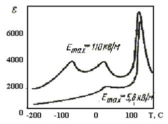 Рис. 2.10.5. Диэлектрическая проницаемость титаната бария в зависимости от температуры при различной напряженности электрического поля