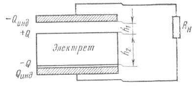 где Q – заряд на поверхности электрета, h1 – зазор между поверхность. Электрета и электродом, h2 – толщина электрета, e - диэлектрическая проницаемость материала электрета. Электреты могут быть использованы для изготовления микрофонов и телефонов, измерения механических вибраций, в качестве пылеуловителей, дозиметров радиации, измерителей атмосферного давления и влажности, электрометров, в клавишных вычислительных машинах, в электрофотографии и во многих других случаях.