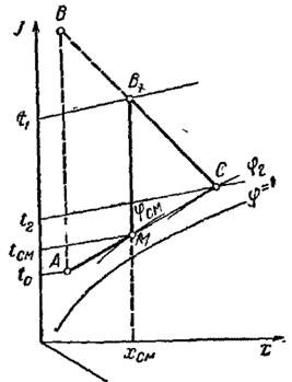 Процесс в сушилке изображается на І-х диаграмме ломаной линией АМВ1С, причем точка А характеризует состояние свежего воздуха, точка С – состояние отработанного воздуха, точка М – состояние смеси. Линия АМ изображает процесс смешения свежего и отработанного воздуха, линия МВ1 – нагревание смеси в воздухоподогревателе, линия В1С – испарение влаги из материала (в сушку). Благодаря рециркуляции части воздуха достигается тот же эффект, что и путем промежуточного подогрева – снижение разности температур t1-t2 в сушилке, т.е. происходит более равномерная сушка.