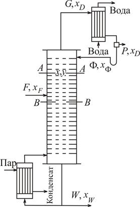 Введены следующие обозначения (рис. 3.15): F, xF – поток (кмоль/с) и концентрация (молярные доли) НК исходной смеси; P, xD – поток и концентрация НК дистиллята; W, xW – поток и концентрация НК кубового остатка; Ф, x Ф – поток и концентрация НК флегмы; G – количество пара (кмоль/с), выходящего из колонны. Тогда материальный баланс колонны по всему потоку