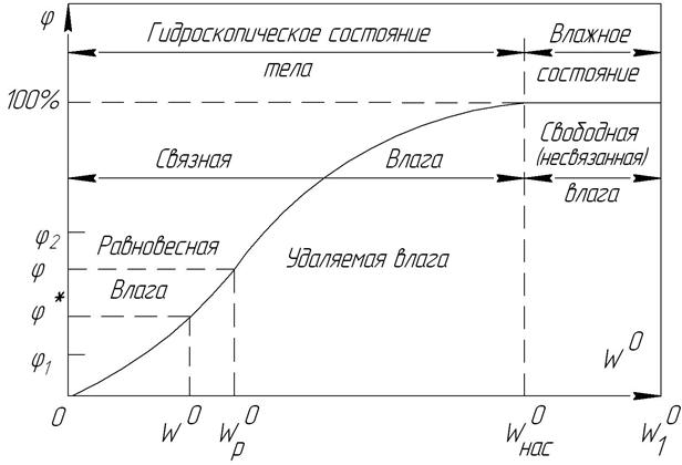 Если влагосодержание материала превышает величину Таким образом, можно выделить две области состояния влажного материала: 1) область влажного состояния (влажная зона), когда давление паров жидкости в материале не зависит от влажности материала и равно давлению насыщения свободной жидкости при температуре материала ( 2) область гигроскопического состояния (зона связанной влаги), когда давление пара жидкости над поверхностью материала отличается от давления насыщенного пара свободной жидкости и зависит от его влажности и температуры ( На практике деление на зоны оказывается условным, так как часто при среднем значении влагосодержания, превышающем Следует отметить наличие на диаграмме φ = f (w 0) изотерм десорбции (рис. 1.5). Причем для кривых сорбция-десорбция характерно явление гистерезиса, указывающее на то, что для достижения одного и того же равновесного влагосодержания относительная влажность газа при увлажнении материала должна быть больше, чем при его сушке. А.В. Лыковым проведен анализ кривых сорбция-десорбция на основе изучения большого экспериментального материала по испарению различных жидкостей из пористых сорбентов. Согласно этому анализу начальный участок изотермы (φ = 0 − 10 %) имеет характерную для мономолекулярной адсорбции выпуклость к оси влагосодержания тела, поглощение жидкости сопровождается значительным выделением теплоты. На участке в интервале φ от 10 до 90% кривые обращены выпуклостью к оси относительной влажности газа, что характерно для полимолекулярной адсорбции. Поглощение жидкости на этом участке сопровождается значительно меньшим выделением теплоты. В интервале φ от 90 до 100% жидкость поглощается без выделения теплоты и является в основном капиллярной. В точке пересечения изотермы с прямой φ = 100% достигается максимальное гигроскопическое влагосодержание. Аналитическое описание связи между равновесным влагосодержанием материала w 0 и относительной влажностью воздуха φ представляет большие трудности. В интервале φ от 10 до 90% А.В. Лыковым предложена простая эмпирическая зависимость: