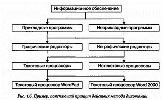 Дихотомия данных. Основным недостатком иерархических структур данных является увеличенный размер пути доступа. Очень часто бывает так, что длина маршрута оказывается больше, чем длина самих данных, к которым он ведет. Поэтому в информатике применяют методы для регуляризации иерархических структур с тем, чтобы сделать путь доступа компактным. Один из методов получил название дихотомии. В иерархической структуре, построенной методом дихотомии, путь доступа к любому элементу можно представить как путь через рациональный лабиринт с поворотами налево (0) или направо (1) и, таким образом, выразить путь доступа в виде компактной двоичной записи. В нашем примере путь доступа к текстовому процессору Word 2000 выразится следующим двоичным числом: 1010.