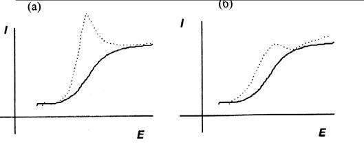 Рис. 27. Полярографические максимумы первого (а) и второго (b) рода (пунктирные линии)