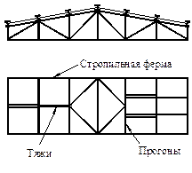 Тяжи ставят между всеми прогонами, за исключением конькового.. При шаге ферм 6м ставят 1 тяж, при шаге 12 м или крутом скате ставят 2 тяжа. Изгибающий момент в плоскости ската определяется как в неразрезной двух или трех пролетной балке. Максимальные напряжения в прогоне от совместного действия изгиба в двух плоскостях