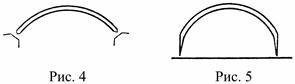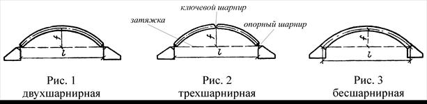 Двухшарнирные арки (рис.1) могут легко деформироваться вследствие свободного поворота в шарнирах, и, благодаря этому, в них не возникает существенное увеличение напряжений от температурных воздействий и осадок опор. Трехшарнирные арки (рис.2) не имеют особых преимуществ по сравнению с двухшарнирными, поскольку их статическая определимость при достаточной деформативности арочных конструкций существенного значения не имеет. Наличие ключевого шарнира усложняет конструкцию арок и устройство кровельного покрытия. Бесшарнирные арки (рис. 3) имеют наиболее благоприятное распределение изгибающих моментов по пролету и поэтому оказываются самыми легкими; однако они требуют массивных опор и их приходится рассчитывать на температурные воздействия. При наличии затяжки опоры воспринимают (в основном) вертикальные нагрузки и поэтому получаются более легкими. Затяжка может одновременно использоваться для устройства подвесного потолка и для создания предварительного напряжения в арках. Очертание арок выбирается близким к линии давления. При симметричной, равномерно распределенной по хорде арки нагрузке (в пологих арках