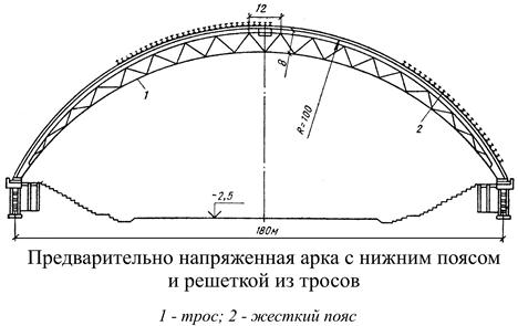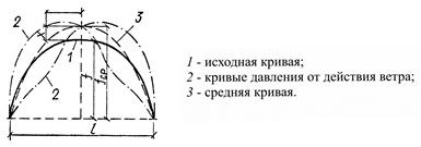 Для высоких арок с большим собственным весом целесообразно принимать очертание по цепной линии (катеноиду), Однако в высоких арках большие усилия вызывает ветровая нагрузка, которая может действовать с обеих сторон и давать две резко расходящиеся линии давления. В этом случае очертание арки целесообразно принимать по середине между двумя крайними линиями давления. В многопролетных арках распоры смежных пролетов в значительной мере уравновешиваются, и средние опоры работают на изгиб только от односторонней временной вертикальной и ветровой нагрузок.