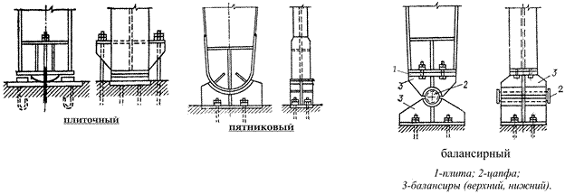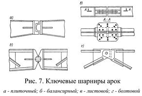 Пятниковые шарниры имеют специальное опорное гнездо – пятник, в который вставляется закругленная опорная часть арки. Пятник делают литым или сварным из листовой стали. Балансирные шарниры применяют в тяжелых арках. Конструкция шарнира состоит из верхнего и нижнего балансиров, в гнезда которых укладывают плотно пригнанную цилиндрическую цапфу. Арку крепят к верхнему балансиру через плиту, которую приваривают к контуру опорного сечения арки и притягивают болтами к балансиру. Торцы опорных сечений арки обычно фрезеруют.