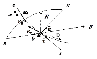 Применим естественный способ задания движения точки. Построим естественный трёхгранник МТNB и направим по направлениям Т, N, B единичные векторы Пусть