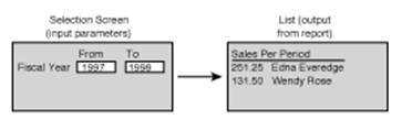 The selection screen and the output screen. Первый экран называют экраном выбора (selection screen). Он содержит входные поля, разрешающие пользователю ввести критерии для отчета. Второй экран – экран вывода (output screen). Он содержит список (list). Список – вывод для отчета, обычно не имеет никаких входных полей. Экран выбора является дополнительным. Не у всех отчетов есть он, однако, все отчеты генерируют список. Программы диалога (Dialog programs) более гибки чем отчеты, и более сложны на уровне программы. Они могут содержать любое число экранов, и последовательность экрана может быть изменена динамически во время выполнения. На каждом экране можно задать входные поля, выводить поля, кнопки, и более одной прокручиваемой области. Отчеты ABAP/4 состоят из пяти компонентов: