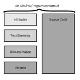 Компоненты программы ABAP/4. Только исходный текст и компоненты атрибута программы являются обхязательными. Остальная часть компонентов является дополнительной. Все объекты разработки и их компоненты сохранены в базе данных R/3. Например, исходный текст для отчета сохранен в таблице базы данных dd010s. Программы ABAP/4 интерпретируются; а не компилируются. В первый раз, когда Вы выполняете программу, система автоматически генерирует runtime object (объект времени выполнения). runtime object – предобработанная форма исходного текста. Это не выполнимая программа, которую можно выполнить на уровне операционной системы. Необходимо, чтобы система R/3 интерпретировала его. Интерпретированный runtime object называют (generated form) сгенерированной формой программы.
