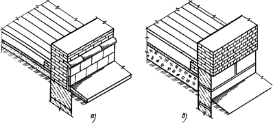 Цоколь (рис.6) - нижняя часть наружной стены здания, лежащая непосредственно на фундаменте. Она подвергается частым механическим, температурным и другим воздействиям. Цоколь зданий облицовывают плиткой или природным камнем (рис.6, а), оштукатуривают цементным раствором. Применяют также подрезной тип цоколя - нижняя часть его выложена из бетонных блоков меньшей толщины, чем верхняя часть из кирпича (рис.6, б).