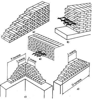 Убежная штраба по сравнению с вертикальной обеспечивает лучшую связь соединяемых участков стен. В вертикальные штрабы для надежности соединений кладки закладывают стальные сетки по высоте из продольных прутков диаметром 4-6 мм и поперечных диаметром З м, укладываемых через 1,5 м по высоте, в том числе в уровне каждого перекрытия. Убежными штрабами (рис.9, г. д) в виде небольших участков стен высотой до шести рядов выкладывают на наружных верстах маяки, которые используют в процессе кладки для закрепления причалок. Маяки располагают по углам (рис.9, б) на расстоянии 10... 12 м друг от друга.