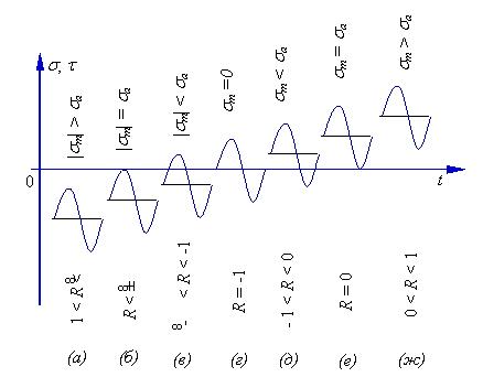 Рис. 1.3. Разновидности циклов напряжений и соответствующие им значения коэффициентов асимметрии
