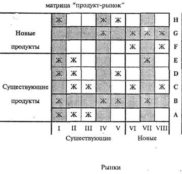 Рис.2 – Матрица «Продукт-технология» Для производства продукта В необходимы технологии 3, 4 и 5. Базисные технологии 2 и 4, которые не имеют наивысшего приоритета, не нуждаются в больших затратах на дальнейшую разработку. Продукт В преимущественно реализуется на имеющихся рынках сбыта, а также на новом рынке VII. Новый продукт G требует технологий 3, 5 и 7, причем технология 7 (в качестве улучшенной технологии) является очень дорогостоящей для разработки. Ее низкий приоритет отражает недостающие собственные возможности и их среднюю привлекательность. Продукт G наряду с существующим рынком сбыта IV прежде всего должен быть реализован на рынках VI, VII и VIII. Поэтому в целом калькуляция для продукта G должна быть составлена с учетом большой степени риска и производство продукта С следует временно отложить. Для производства продукта В также необходимо использовать технологии 2 и 4; они имеют средний приоритет. Продукт В будет продаваться на существующих рынках I, IV и V и на новом рынке VII. По определенным до настоящего времени технологиям 2, 3, 4, 5 и 8 могут производиться также продукты С, Е и Н. В портфеле рынка сбыта они имеют средний приоритет, но следует принимать во внимание потенциалы их финансового обеспечения. К тому же наряду с приоритетными рынками они реализуются на существующих рынках II и V. Таким образом, из идентифицированных до сих пор продуктов В, С и Н не удовлетворяют одному согласованному результату. На этом основании продукты С и D, имеющие средний приоритет, должны быть переоценены. При этом должен приниматься во внимание потенциал финансового обеспечения заказа обоих продуктов. Для производства продукта С требуются дополнительно технологии 6 и 7. Технология 7 связана с очень высокими расходами на обновление, которые, разумеется, также могут быть отнесены к риску производства С. Усовершенствованная технология 6 имеет средний приоритет. Продукт С не имеет приоритета по рынку сбыта и к тому же ведет к ущербу при применении новой технологии. Производство продукта D требует применения улучшенной технологии и традиционной технологии I. К тому же отсутствует необходимость в каком-либо новом рынке сбыта. В результате реализация продукта D должна быть отнесена к рынку сбыта продукта С. Неоцененными остались продукты А и F, которые в портфеле рынка имеют ограниченный приоритет. Их потенциал финансирования заказа небольшой. Производство продукта А не требует новой технологии, и он должен реализовываться исключительно на существующих рынках сбыта. Продукт F, напротив, требует технологии 6 и должен реализовываться на двух новых рынках VI и VIII, кроме того, его производство может вести к ущербу при производстве по новой технологии. Таким образом, можно определить следующую стратегию: – Продукт – дальнейшая разработка продуктов В и Е. Приспособление производства продукта D к прерывистой технологии 8. Использование производства продуктов G и F. Поиск новых видов продукции, особенно с использованием технологии 8 и для рынков сбыта I, П, IV, V и VII; – Технология – Новая разработка технологии 8, дальнейшая разработка технологий 1, 2, 3, 4 и 5. Соблюдение технологий 6, 7 и 9; – Рынок – Дальнейшая разработка рынков сбыта I, П, IV иV. Освоение рынка VII для продуктов В и Е. Пустить на самотек рынок III. Отказаться от использования рынков VI и VII. Эти данные иллюстрирую