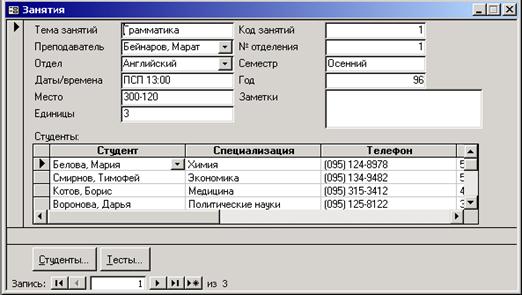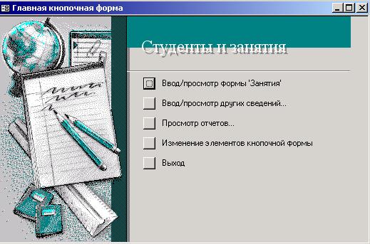 Элементы управления Элементом управления называют любой объект формы или отчета, например надпись или поле. Элементы управления используются для ввода значений или их отображения на экране. Элемент управления может быть связан с полем таблицы либо иметь вид прямоугольника или линии. Вычисляемые поля, как и рисунки, диаграммы, переключатели и флажки, так же являются элементами управления. Существуют элементы, которые не являются частью MS Access, а созданы отдельно – OLE- элементы. Элементы управления при работе с формами и отчетами создаются и используются почти одинаково. Рассмотрим некоторые из них. Основные элементы управления: - Надпись. Служит для отображения текста. - Поле. Позволяет вводить данные. Расширенные элементы управления ввода данных: - Переключатели. С ними можно связывать команды, например, выполняющие фильтрацию. На экране отображается в виде кружочка. При активизации этого элемента управления внутри кружочка появляется точка. - Флажки. Действуют аналогично переключателям, но в отличии от них, допускают множественный выбор. Удобны для управления режимами сортировки данных. При активизации этого элемента управления в квадрате появляется галочка. - Список. Может содержать фиксированный набор значений или значения из заданного поля одной из таблиц в форме или отчете. - Поле со списком. Применяется так же, как и список, но позволяет вводить и другие значения, занимает меньше места в форме, поскольку список открывается только после щелчка на раскрывающейся кнопке. - Командные кнопки. Используются для вызова макроса или запуска программы на языке Basic для выполнения какого либо действия. С каждой из них можно связывать какую-либо полезную команду, например, команду поиска записи, перехода между записями и другие. - Вкладки. Позволяют разместить большое количество информации на ограниченной площади. На вкладках размещают другие элементы управления. - Поле объекта OLE. Служит для размещения внешнего объекта, соответствующего принятой в Windows концепции связывания и внедрения объектов. Объектом, как правило, является иллюстрация, видеозапись, музыкальный фрагмент или голосовое сообщение. Существуют два типа полей для размещения объектов OLE: Свободная рамка объекта (не связана ни с каким полем таблиц БД) и Присоединенная рамка объекта (связана с одним из полей таблиц). - Подчиненная форма/отчет. Служит для отображения еще одной формы или отчета в исходной форме или отчете.