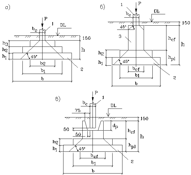 Рис. 8.9. Схемы железобетонных фундаментов а – монолитное сопряжение фундаментной плиты с колонной; б – то же, с подколонником; в – сопряжение монолитного фундамента со сборной колонной; 1 – колонна; 2 – плита; 3 – подколонник