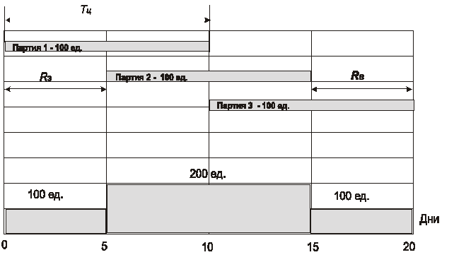 где N - годовая программа изготовления деталей, ед.; Очевидно, что при прочих равных условиях себестоимость деталей Сед из цветных металлов будет больше чем из черных; себестоимость крупных деталей будет больше себестоимости мелких; по ходу технологического процесса себестоимость детали будет увеличиваться. Принимая во внимание вышесказанное можно прийти к следующим выводам: 1) для деталей из цветных металлов партия n0 будет меньше, чем для деталей из черных металлов; 2) для мелких деталей n0 будет больше, чем для крупных; 3) для заготовительных цехов величина n0 будет больше, чем для сборочных. Нормативные партии нужно запускать в производство через определенные промежутки времени R. Величина R – это периодичность запуска или выпуска нормативной партии деталей в цех или из цеха. Определенная периодичность запуска-выпуска деталей позволяет добиться ритмичной работы цехов и участков. Ритмичность - важный показатель повышения уровня производительности труда в цехе или на участке. На рис. 8 показан график запуска - выпуска нормативной партии деталей и соответствующее изменение циклового задела (незавершенного производства) в цехе. Исходные данные для построения графика: нормативная партия обработки деталей n0 - 100 единиц; продолжительность цикла изготовления этой партии Тц – 10 дней; периодичность запуска или выпуска нормативной партии R – 5 дней.