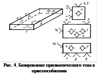 По числу лишаемых степеней свободы технологические базы могут быть: установочными, направляющими, двойными направляющими и двойными опорными, по характеру проявления: явными, скрытыми. Явные базы – материальные поверхности контакта опорных точек и заготовок. Скрытые базы реализуются на предполагаемых элементах заготовок (осях, пересечениях осей и т.д.).