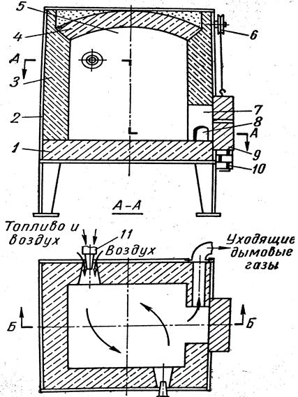 Рис. 7. Схема устройства камерной печи: 1 – под; 2 –металлический каркас; 3 – стены; 4 – свод; 5 – рабочее пространство печи; 6 – блок; 7 – окно загрузки, выгрузки; 8 – канал; 9 – чугунная заслонка; 10 – противовес; 11– горелка
