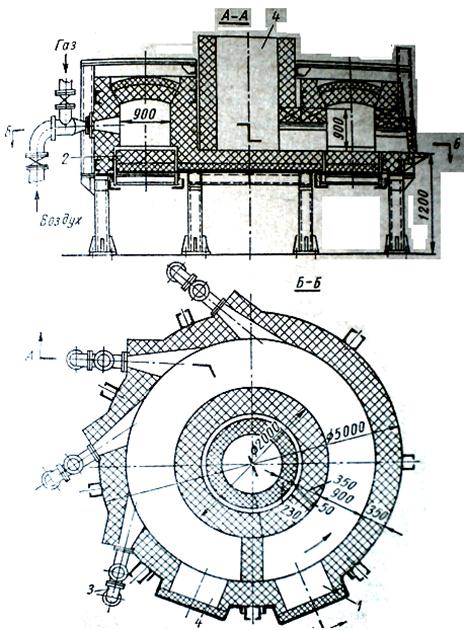 Щелевые или очковые печи, предназначенные для нагрева концов прутков или труб, представляют собой сравнительно небольшие печи, применяющиеся в штамповочных цехах. В этих печах загрузочным окнам придают форму щелей или ряда отдельных отверстий. К печам непрерывного действия относятся методические печи, в которых заготовка в процессе нагрева передвигается от места загрузки к месту выдачи. Методические печи имеют довольно длинное рабочее пространство (до 30 метров и более), которое может состоять из нескольких зон с различной температурой. Методические двухзонные печи часто применяют в кузнечно-штамповочных цехах для нагрева мелких и средних заготовок и небольших слитков. Основными особенностями скоростного нагрева являются: повышение температуры рабочего пространства до 1400–1500 ˚С и обеспечение всестороннего обогрева заготовок. Скорость нагрева при этом способе повышается не только за счёт увеличения перепада температур, но и за счёт повышения скорости движения газов, омывающих нагреваемые заготовки. В газовых печах скоростного нагрева тепло, передаваемое металлу излучением, составляет 80 %, а тепло, передаваемое конвекцией, – всего 20 %. При скоростном нагреве достигается уменьшение расхода топлива, угара металла и увеличение производительности за счёт сокращения времени нагрева. Скоростной нагрев осуществляется в механизированных и автоматизированных печах, отапливаемых высококалорийным газом или мазутом. Печи скоростного нагрева применяются двух типов: камерные – для нагрева коротких заготовок и проходные – для длинных прутков и труб. Из применяющихся способов безокислительного нагрева практический интерес представляют: нагрев в расплавленных солях; нагрев с образованием защитных покрытий на поверхности нагреваемых заготовок; нагрев в муфельных печах с защитной атмосферой; нагрев в камерных печах открытого пламени. На поверхность нагреваемой заготовки тем или иным способом наносится плёнка, предохраняющая её от окисления. Одним из наиболее прогрессивных методов безокислительного нагрева под ковку и штамповку является нагрев в камерных печах открытого типа. В этих печах нагрев металла происходит в атмосфере не полностью сгоревшего газа. В механизированных печах основные трудоёмкие операции – загрузка заготовок в печь, перемещение и выдача их из печи – механизированы. В этих печах заготовки перемещаются различными способами: перекатыванием цилиндрических заготовок по наклонному поду, с помощью толкателей, шагающих балок, роликового и вращающегося пода и т.п. Печи с шагающими балками применяют для нагрева листового, полосового и сортового материала; печи с роликовым подом – для нагрева листового и полосового материала под штамповку, гибку и другие операции; конвейерные печи – для нагрева концов заготовок для высадки на горизонтально-ковочных машинах и др. В своё время большое признание получили карусельные печи, одна из которых представлена на рис. 8, позволяющие легко обеспечить требуемый режим нагрева заготовок любой формы. Карусельные печи по сравнению с методическими занимают меньшую площадь и обеспечивают более равномерный нагрев, так как заготовки на поде этих печей располагают не вплотную. Карусельные печи бывают двух разновидностей: с кольцевым подом и тарельчатым; первые по харак
