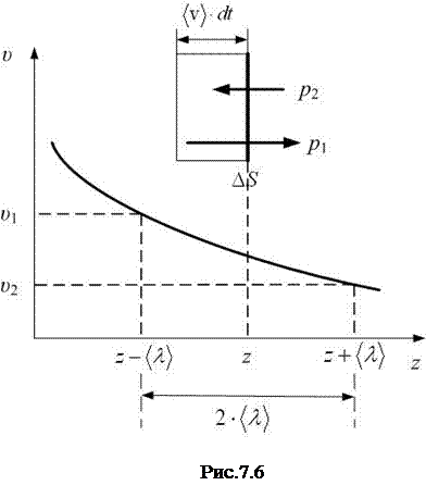 б) Коэффициент вязкости При выводе формулы для коэффициента вязкости рассуждения аналогичны. Пусть скорость направленного движения слоёв газа убывает с координатой Z (рис.7.6). Концентрации молекул слева и справа одинаковы, и за время