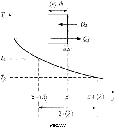 в) Коэффициент теплопроводности Пусть вдоль оси OZ изменяется температура (рис.7.7). В результате теплового движения молекулы переносят через площадку свои средние тепловые энергии, которые сложились на расстоянии