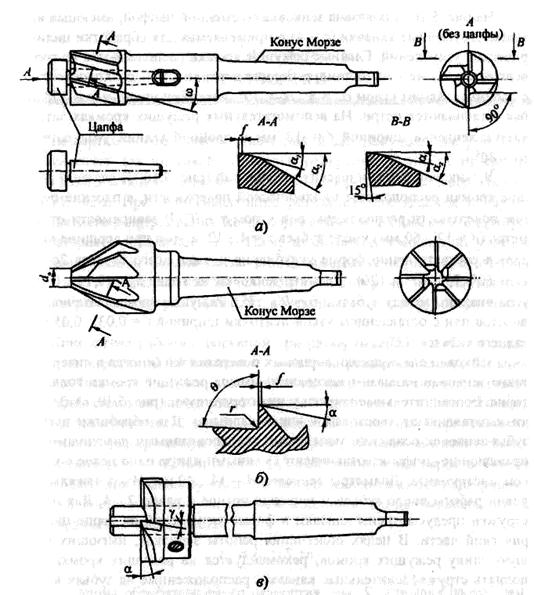Рис. 5.10. Зенковки: а - для цилиндрических углублений; б - для конических углублений; в - для подрезки торцов Зенковки изготавливают из быстрорежущей стали, а иногда оснащают напайными твердосплавными пластинами. Хвостовики зенковок соединяются с режущей частью сваркой и могут быть цилиндрическими или коническими. На рис. 5.10, а показана зенковка со сменной цапфой, имеющая винтовые стружечные канавки (z = 4) и применяемая для обработки цилиндрических углублений. Главные режущие кромки располагаются на торце, вспомогательные – на цилиндре. Задние поверхности – двухплоскостные с двойным задним углом α1 = 8°, α2 = 30°, передний угол γ = ω = 15°. Зубья затачиваются остро. На вспомогательных режущих кромках затачивается ленточка шириной f = 0,3 мм и двойной задний угол α1 = 8°, α2 = 30°. У зенковок для конических углублений (рис. 5.10, б)главные режущие кромки расположены на конической поверхности, а плоские передние поверхности расположены под углом γ = 0°. В зависимости от диаметра (d = 12...60 мм) число зубьев z = 4... 12, а угол при вершине выбирается соответственно форме углубления и чаще всего берется 2φ равным 60°, 75°, 90° и 120°. Диаметр зенковки на торце d0 = (0,15...0,18) d, угол впадины между зубьями θ = 90...75°. Режущая кромка затачивается доостра или с оставлением узкой ленточки шириной f = 0,03...0,05 мм и заднего угла α = 12°. Зенковки для подрезки торцовых поверхностей (иногда в литературе такие зенковки называют цековками) имеют режущие кромки только на торце. Вспомогательные кромки у них отсутствуют (рис. 5.10, в). Зенковки изготавливают хвостовыми или насадными. Для обработки чугунов зубья зенковок оснащают напайными твердосплавными пластинами. Направляющие цапфы изготавливают сменными или за одно целое с корпусом инструмента. Диаметры зенковок d = 14...40 мм. Из-за тяжелых условий работы число зубьев у зенковок четное и равно 2...4. Для отвода стружки предусмотрены канавки в форме углублений на торце цилиндрической части. В целях облегчения работы зенковок, имеющих большую длину режущих кромок, рекомендуется на режущих кромках выполнять стружкоделительные канавки, расположенные на зубьях в шахматном порядке.