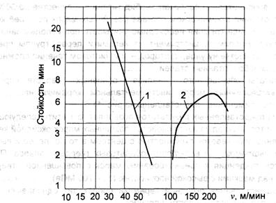 Рис. 1.7. Зависимость стойкости при ширине фаски износа /7Э=0,3 мм от скорости резания при точении заготовок из никелевого сплава с S =0,25 мм/об; t - 3 мм. Резание с использованием жидкой СОТС: 1 - точение твердосплавными пластинами М20; 2 - точение керамическими пластинами