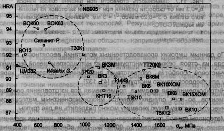 Рис. 1.8. Классификация основных отечественных и зарубежных марок режущей керамики по их основным свойствам (HRA, <Ти) в сравнении с марками твердых сплавов групп ВК и ТК, ТТК